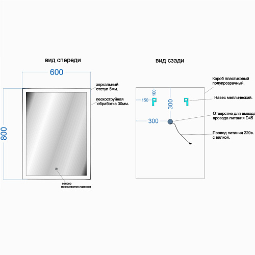 Оснащение LED подсветка, сенсор вкл/ выкл