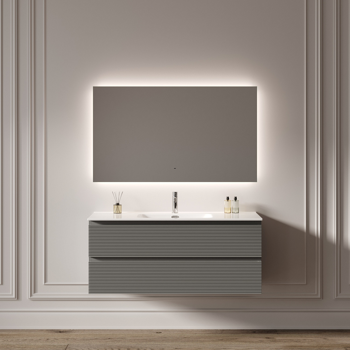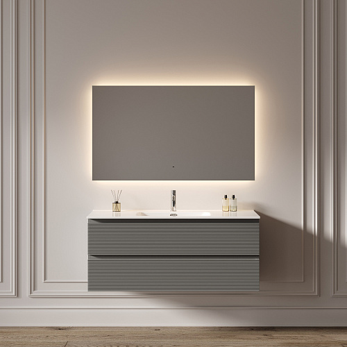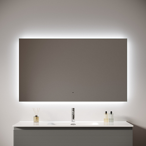 Зеркало для ванной комнаты с подсветкой 1200x700 мм Возможность выбора температуры подсветки 2700K/4000K/5000K Выключение и включение подсветки на взмах руки Диммируемое управление яркостью подсветки На изображении зеркало представлено с коллекцией мебели Folk и смесителем из коллекции Etna.
