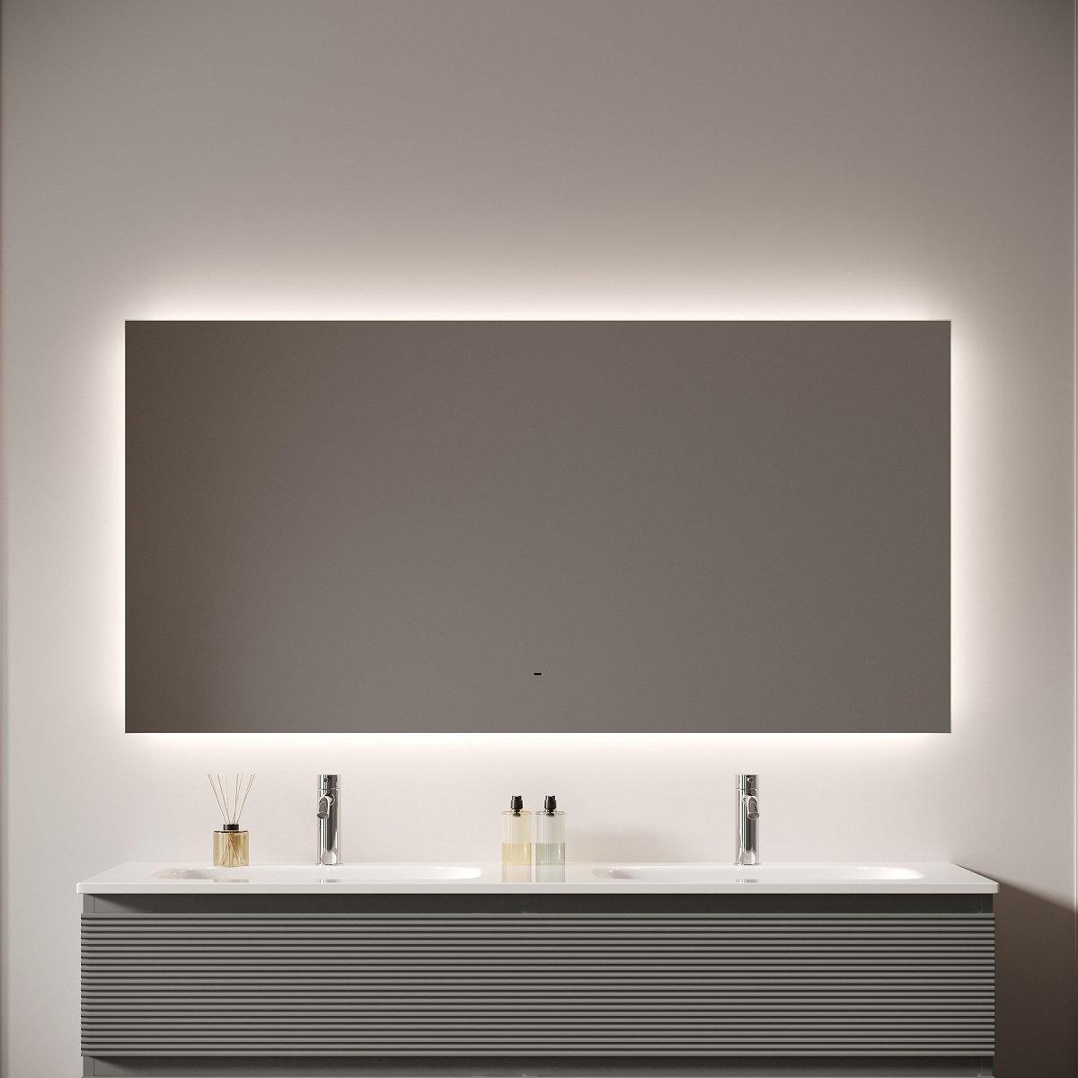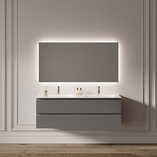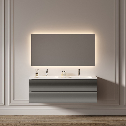 Зеркало для ванной комнаты с подсветкой 1400x800 мм Возможность выбора температуры подсветки 2700K/4000K/5000K Выключение и включение подсветки на взмах руки Диммируемое управление яркостью подсветки На изображении зеркало представлено с коллекцией мебели Folk и смесителем из коллекции Etna.