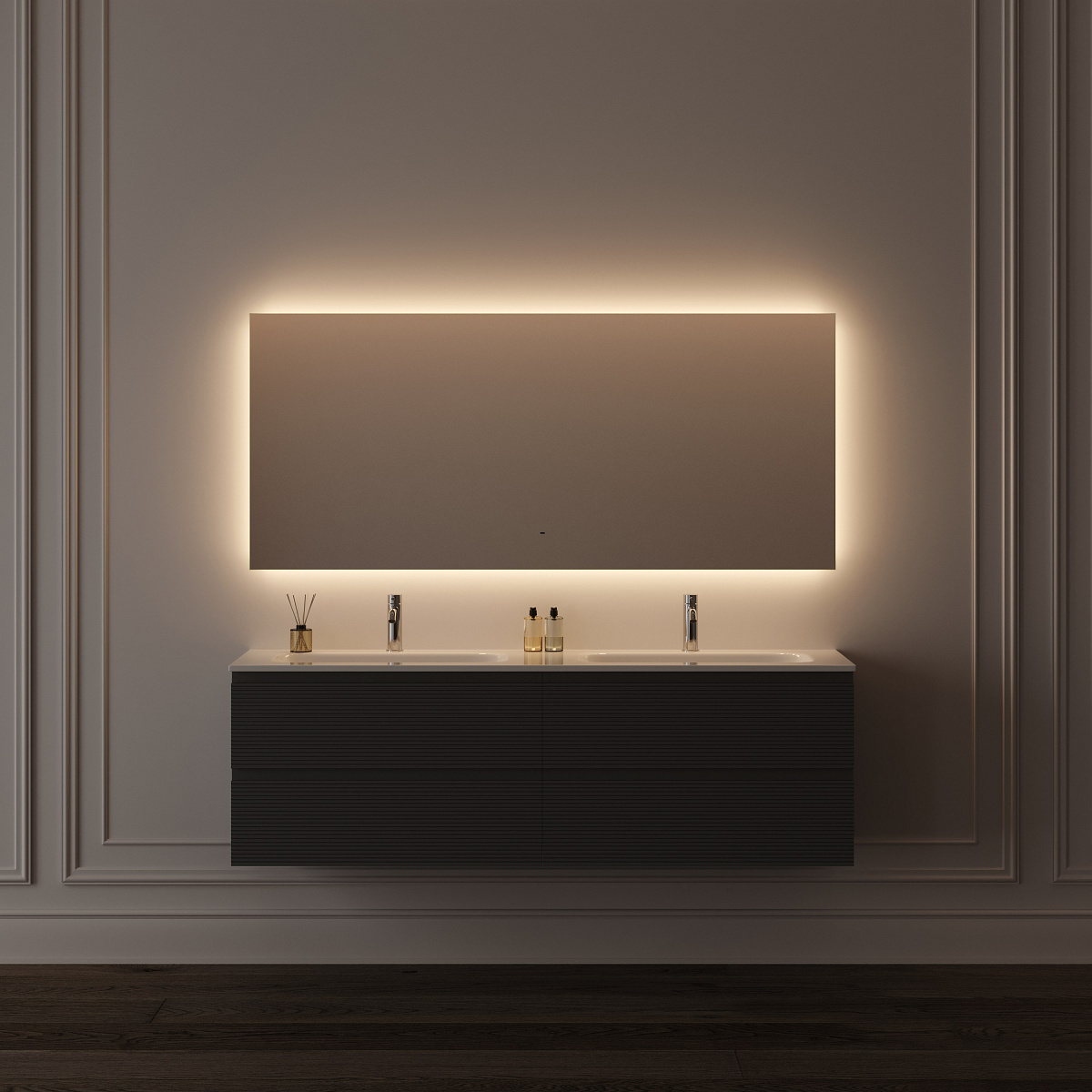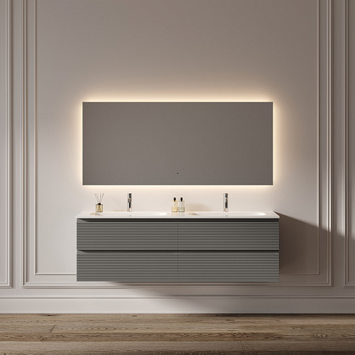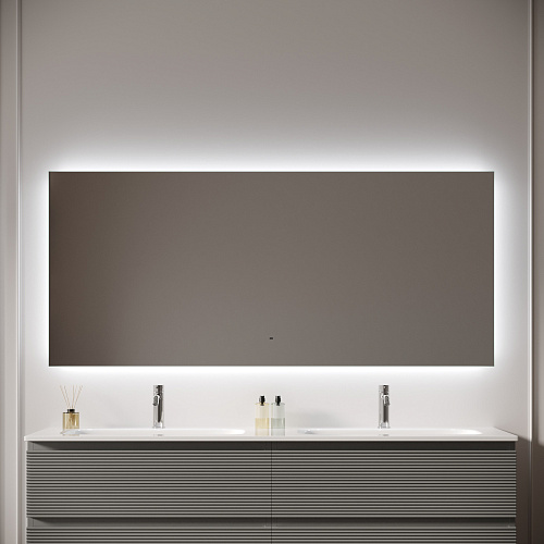 Зеркало для ванной комнаты с подсветкой 1600x800 мм Возможность выбора температуры подсветки 2700K/4000K/5000K Выключение и включение подсветки на взмах руки Диммируемое управление яркостью подсветки На изображении зеркало представлено с коллекцией мебели Folk и смесителем из коллекции Etna.