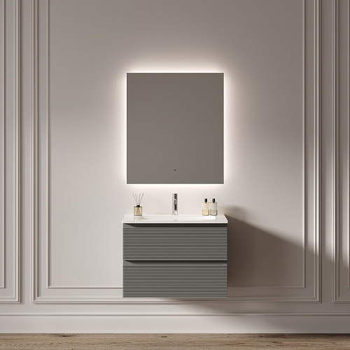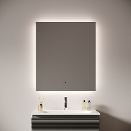 Зеркало для ванной комнаты с подсветкой 800x700 мм Возможность выбора температуры подсветки 2700K/4000K/5000K Выключение и включение подсветки на взмах руки Диммируемое управление яркостью подсветки На изображении зеркало представлено с коллекцией мебели Folk и смесителем из коллекции Etna.