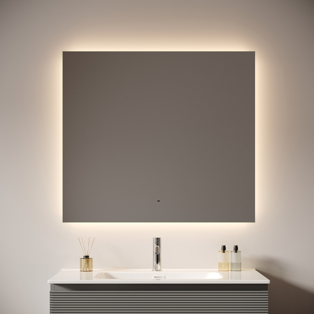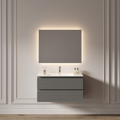Зеркало для ванной комнаты с подсветкой 900x700 мм Возможность выбора температуры подсветки 2700K/4000K/5000K Выключение и включение подсветки на взмах руки Диммируемое управление яркостью подсветки На изображении зеркало представлено с коллекцией мебели Folk и смесителем из коллекции Etna.